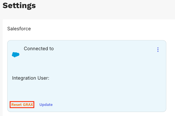 * Navigate to `Settings` within the GRAX Application and expand the `Salesforce` section to confirm that the you are connected to the correct SFDC org with the correct Integration User. You will see a green dot followed by the word `Connected` if the connection is successful. If you need to modify the connection details, click `Update` to reset the connection