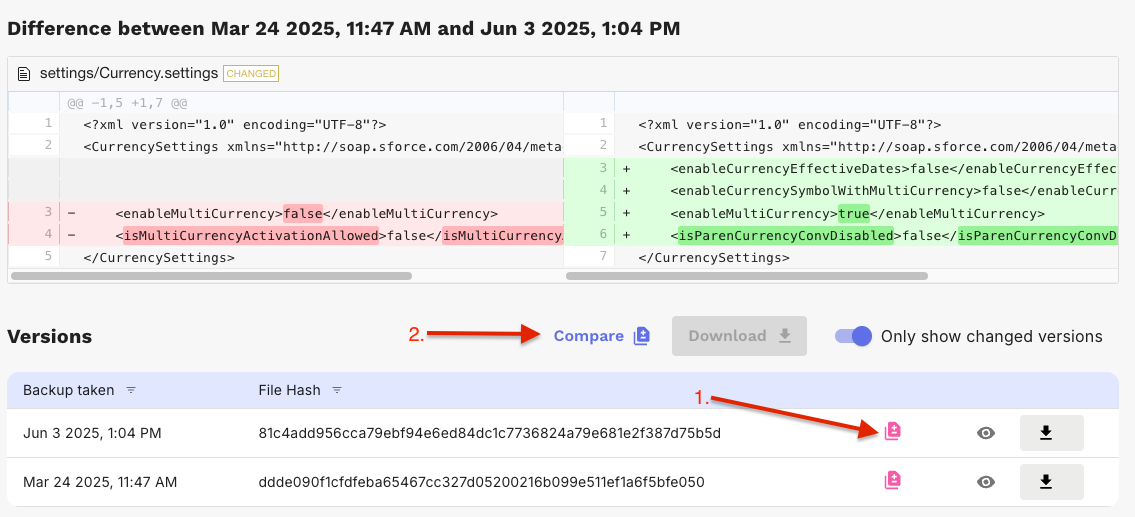To see the differences between 2 versions of a metadata file: