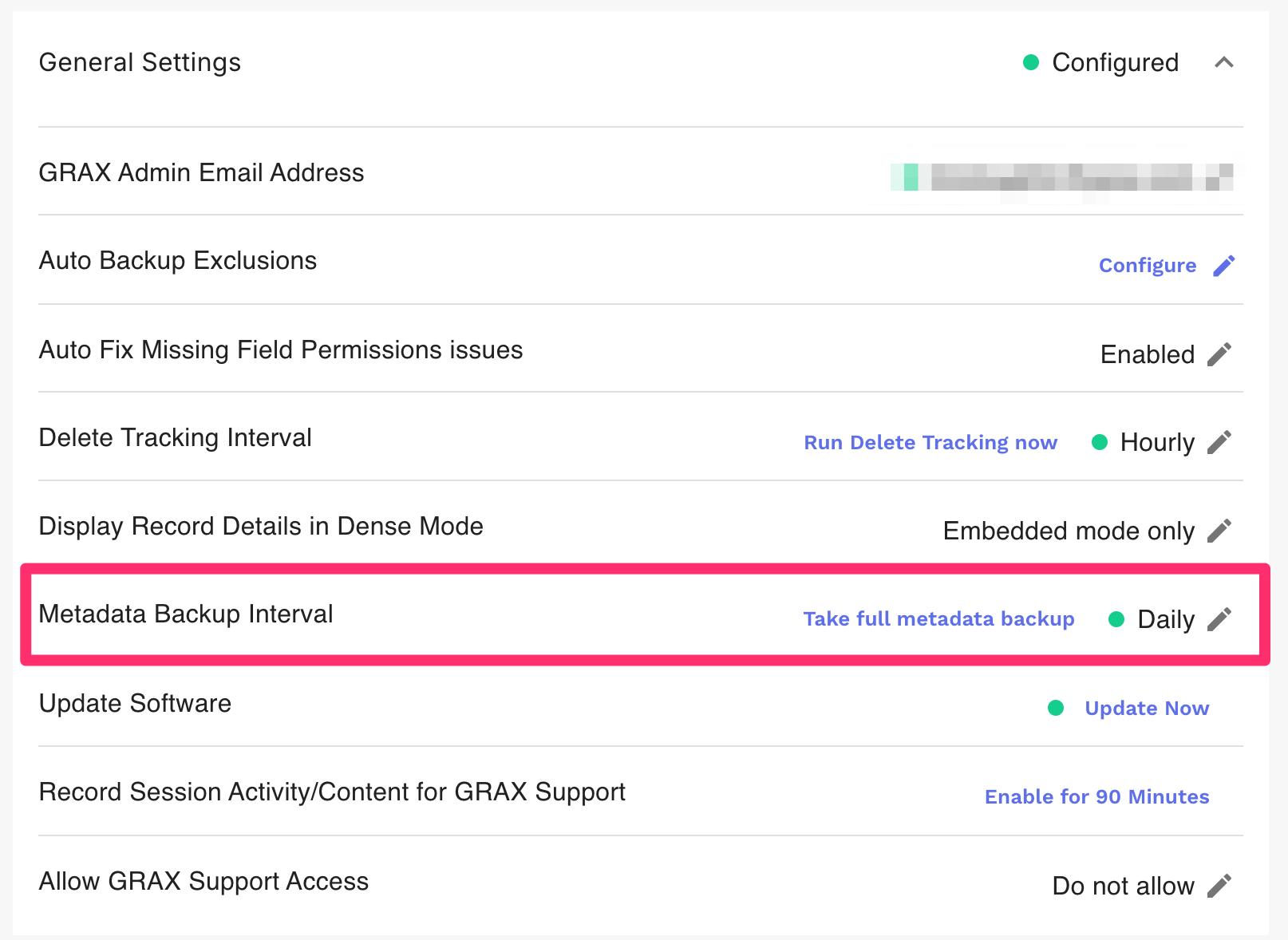 By default, GRAX checks for any new or changed metadata once per day. To change the metadata backup frequency, simply select a backup interval in the `General Settings` tab.