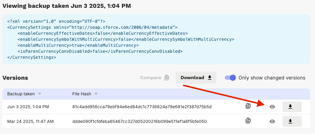 To view the contents of a metadata file version, click the Visibility / Eye icon for the desired version, the file will be displayed above the version list.
