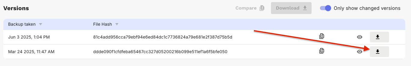 To download the contents of a metadata file version, click the "Download" icon for the desired version.